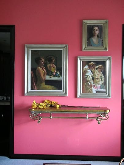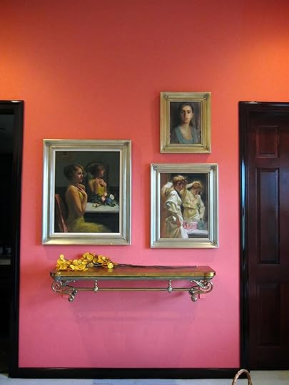 The opposing wall in this room is painted a bold and well-named color, Begonia (Sherwin Williams) and tends to bounce lots of strong ambient color around the space, much more pronounced at night when the overhead incandescent lights replace the natural daylight.The photo below is also taken under natural light. The frames on this wall are all very similar, a cool gold or warm silver in color.