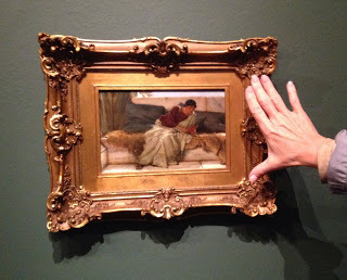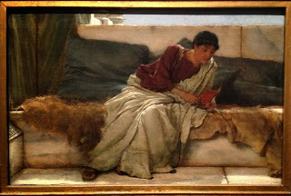 One of my all-time favorite painters is Sir Lawrence Alma-Tadema; this tiny gem, "A Difficult Line from Horace" was a sparkler; you can see the painting's scale in comparison to my hand.