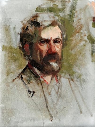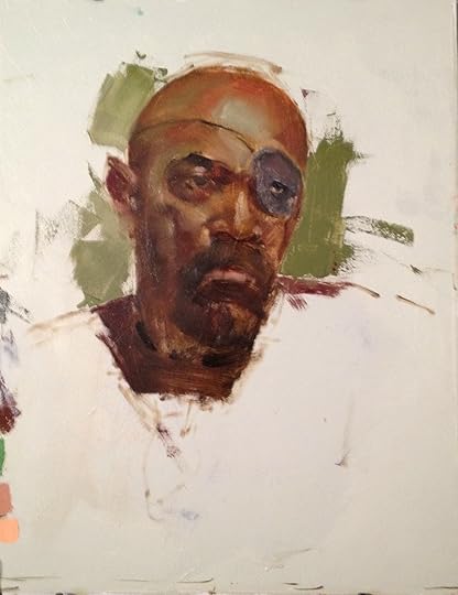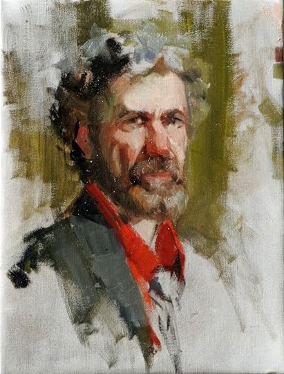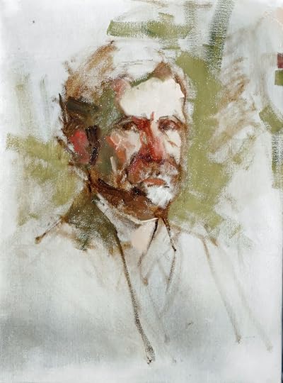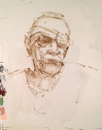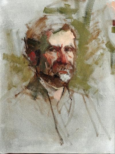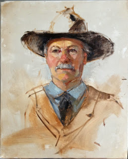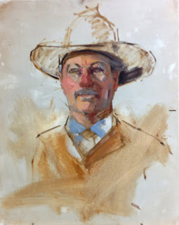 And no matter how frequently or well an artist paints from photographs, without refreshing your eye and brain by working from life,you'll get rusty. So in any case, when I am able, I paint with a great group of artists in Prescott on Friday mornings. This is from this morning, Carl. Terrific model, gentlemanly and at home in his wintry western garb, with a hat rivaling the Canadian Mounties.I took photos at three different point.