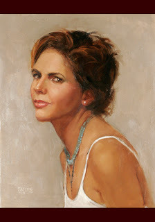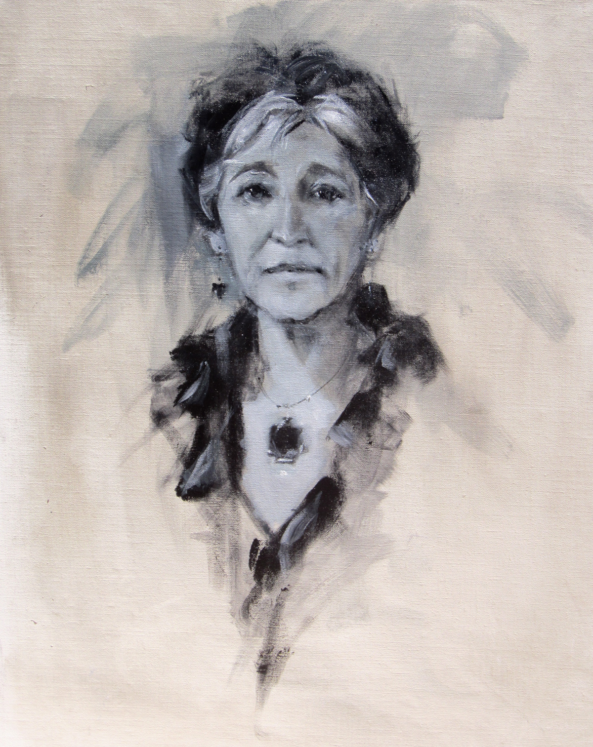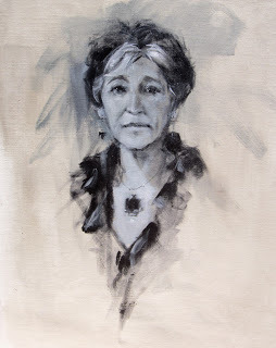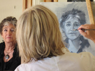 Last week, the Portrait Artists of Arizona visited me for a studio tour. Since my studio is just one room, the tour itself took about 7 minutes, LOL. So we 'volunteered' Joan to sit for a while so I could try out the new Torrit Grey color for 2012. For those of you unfamiliar with Torrit Grey, here are the details - it's a fun annual competition by the Gamblin folks. (That's Gamblin, not gamblin')