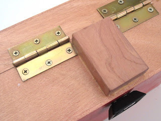 I added some sturdy hinges , and glued a cedar block (from Bed Bath & Beyond) on the back to act as a stop so that the id won't open too far.