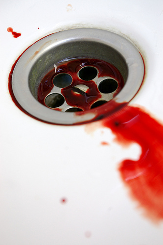 blood red pennies patter on the white tiles,