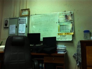 This, it seemed, became an opportunity to look at me gravely, and shake their heads in unison. I offered them my virgin UK passport instead, but they wouldn’t accept it. Apparently, they have a preference for passports that are neither too full or too empty: and either of these offers them a fortuitous excuse to impose a ‘fine’. I am guided into a makeshift office that does duty most of the time, when no money is to be made, as a lunchroom. The old wood and glass cases that once might expect to overflow with wilted and flyblown official documents are host to haphazard piles of brightly coloured plastic crockery, and a few mangled aluminum utensils.