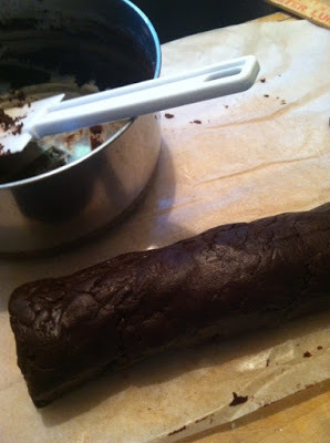 In a medium saucepan over medium-low heat, whisk the butter, granulated sugar, and chocolate chips together until the butter and chocolate have just melted. Remove from the heat and whisk in the egg and vanilla until well blended. Whisk in the flour, cocoa powder, salt, and baking soda until well blended. Let cool for 15 minutes, then transfer the saucepan to the refrigerator and let cool for 30 minutes or until the dough is thick like modeling clay.Place a 15-inch long sheet of parchment paper on a work surface. Spoon the dough into a 12-inch line on the parchment paper. Roll the parchment paper around it and work the dough into a smooth cylinder about 10 inches long and 2 1/2 inches in diameter. Wrap and chill the dough for 2 hours or overnight. (You can also wrap and freeze the dough for up to 3 months at this point.)
