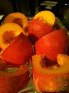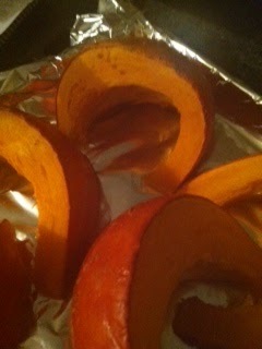 I cut it into wedges and removed the seeds, the placed the wedges on a baking sheet lined with aluminum foil to roast in the oven.