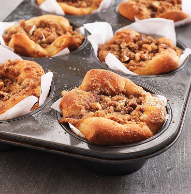 Whole Wheat Pumpkin-Pecan Cinnamon Crowns start with a whole wheat dough, then gets a pumpkin pie filling with cinnamon pecan streusel on the top. Instead of rolling the dough up into a cylinder, you roll it out and cut it into squares. You put each square of dough into a muffin cup, and then dollop in the filling and top with streusel.