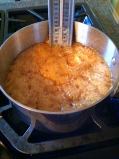 You can double this recipe and pour it out onto a large 11 x 17-inch baking sheet to cool. When the candy thermometer registers 250 degrees F., my advice is to stand watch. A watched pot does actually boil and will produce a perfect toffee.