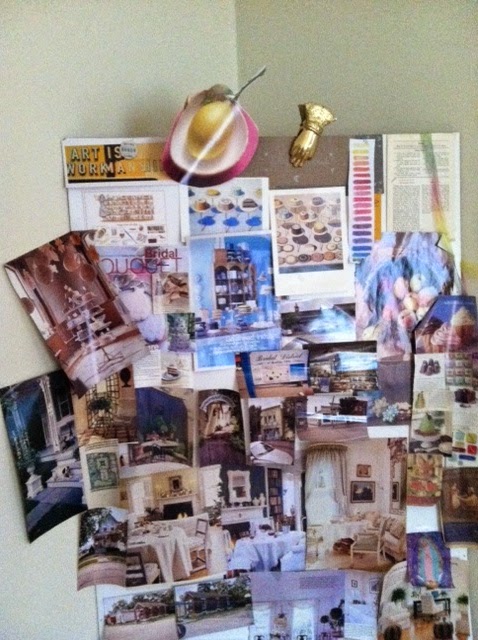 To help me focus, gather ideas, and spark my imagination, I created a vision board. I used a long piece of poster board, magazine clippings, photographs, postcards, and other visual elements like rainbow ribbon and a fanciful "Hand of Fatima" golden clip. My vision board is not fancy, as you can see.