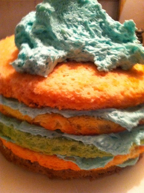 To assemble the cake, save the most domed layer for the top (or make Neely's pattern with lavender on the bottom, then coral, lime, yellow, and pink on top). Place the flattest layer on a serving plate and spread lightly--a skim coat-- with about 1/3 cup Robin’s Egg Blue Buttercream Frosting. Place another layer on top and frost lightly with another 1/3 cup frosting. Repeat with the third and fourth layers. Place the top layer.