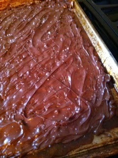 Carefully pour the toffee mixture onto a baking sheet, then strew with chocolate chips. Let them melt for 2 minutes, then swirl the melted chocolate with a knife or thin metal spatula.