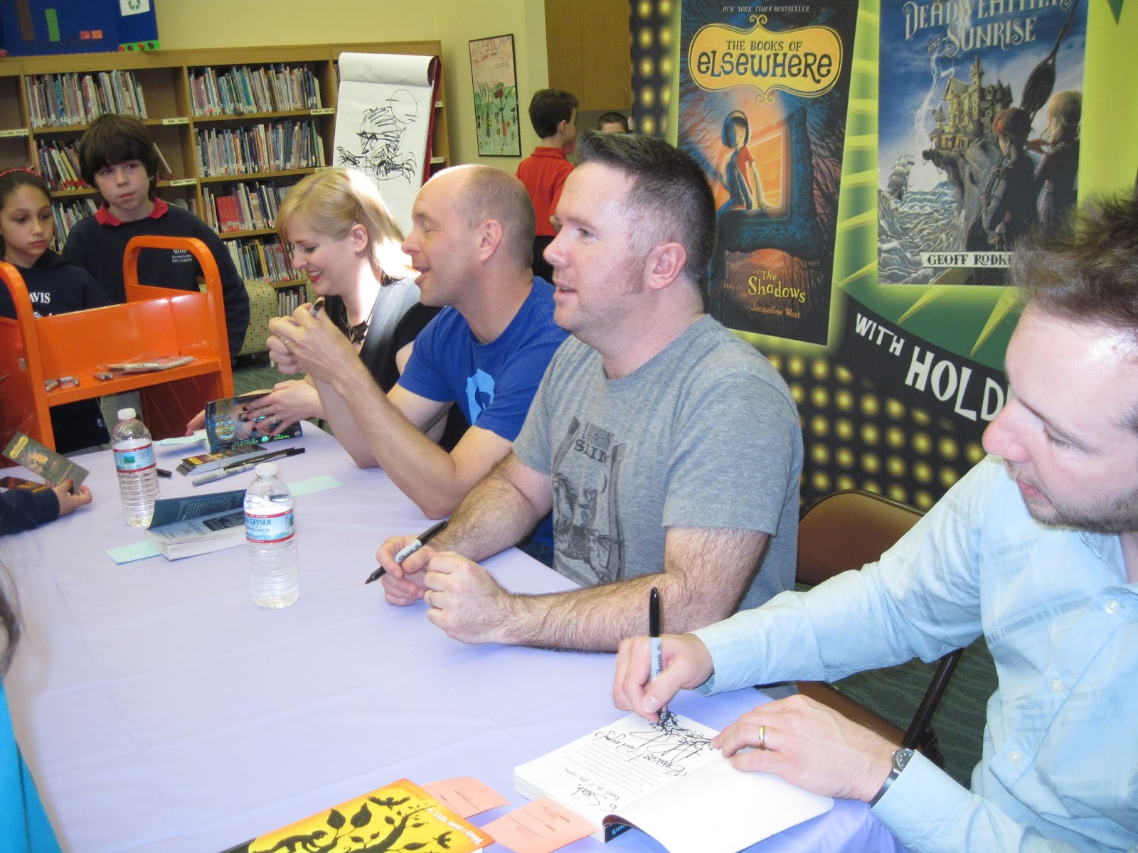 And the final day? New Jersey awaited, under the watchful eye of Watchung Booksellers (specifically the lovely Marisela and Liane!) What hospitable hosts and grand (and giddy) company! Our first port of call was Charles H Bullock Elementary in Montclair, followed by Ridgewood Avenue school in Glen Ridge. Both schools provided us with a terrific send off for the final Endangered Authors day. Adam's temptation to total the set on the final event at Ridgewood Ave needed to be tempered - I suspect he'd seen a Who documentary or somesuch the night before. Or he'd had too much coffee at the fab Comfort Food Kitchen that lunch. We certainly went out on a high, with Peter pulling out all the stops as Holden A Grudge for the last two shows. There was mad cackling, pantomime child-bullying, screaming, hooting and hollering - all wholesome, nutritious family entertainment. And I only managed to upset one girl with my One Direction mockage (sorry Hannah!)
