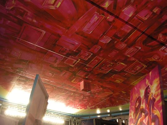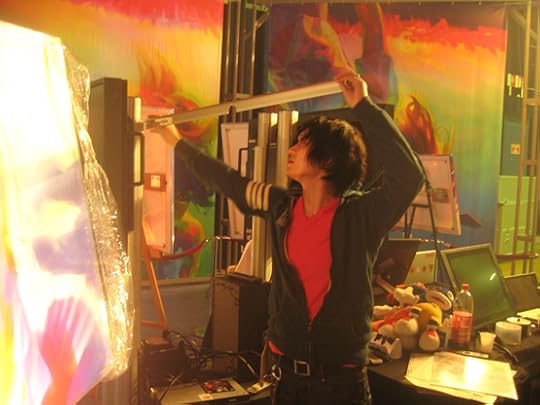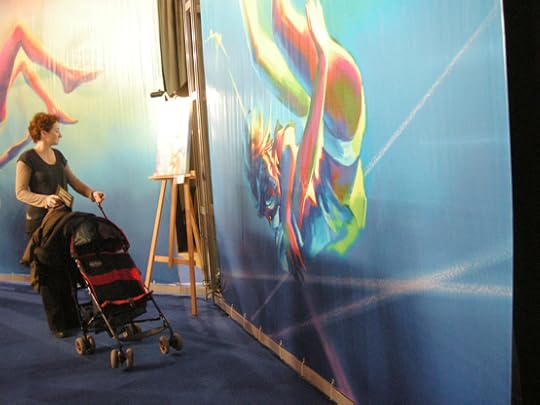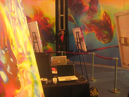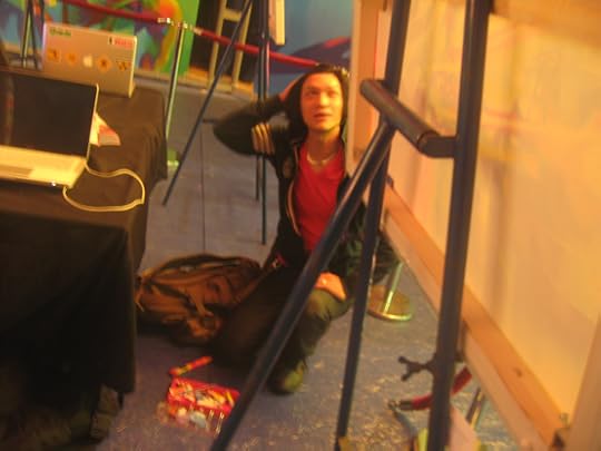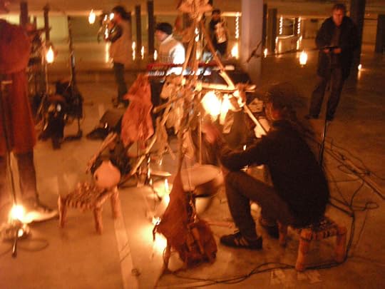 在法国colomiers漫展上,除了我的中国本色动漫艺术展这个比较特殊的show,还有一个特别的show,既所有艺术家们在现场乐队的演奏中,一起创作巨幅壁画。场地选择在一个巨大的地下车库。灯光全关,大家举着蜡烛作画。模拟古代岩洞壁画的效果,现场乐队几乎是我听过最美的现场,风格算是"世界音乐",以古代简陋的吹奏乐器和一大堆挂起来的石头片做的打击乐器为特色。有吉他和键盘。女主唱是黑人,据说以前和非儿柯林斯一起唱歌。后来,这黑人阿姨还来找我签售了。