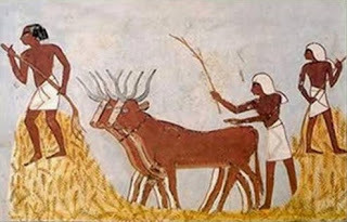 Oxen (1 Kings 19:21) The ox may have been mankind's earliest draft animal. Written sources, paintings, and sculptures indicate their usage dates back a minimum of five thousand years. They are found in art and records from Egypt, Ur, and Babylon. Every farming civilization that had access to some breed of bovine has used them for draft purposes. An ox is defined as a neutered male bovine trained for and used as a draft animal. The neutering of a male calf alters its growth patterns and personality giving it a more docile temperament. The meat from an ox is very different from that of the fatted calf. The ox would have subsisted on coarse roughage. That, along with its work regime and advanced age at slaughter, would have precluded the juicy tenderness associated with the fatted calf. Oxen are typically used in pairs known as a team. When working, the two animals were joined by a wooden yoke. The most common form is the neck or bow yoke which consists of a shaped crosspiece (the yoke) that rests on the top of the ox's neck, just in front of his shoulder blades, and a U-shaped piece (the bow) that goes under the neck with its ends going up through two holes in the yoke. The yoke must be carefully carved, fitted and smoothed so that it does not irritate the animal’s neck when it works.