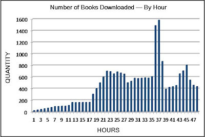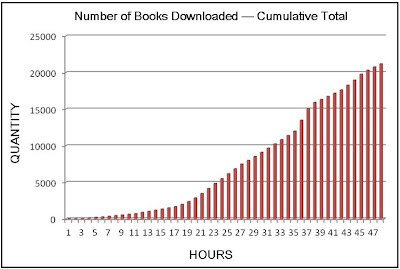 CRUNCHING THE NUMBERSI’ve created three graphs of my results. One details the cumulative total of eBooks downloaded over the two-day period by hour, which was 21,200. The second graph shows the approximate distribution of downloads hour-by-hour. (I had to do some averaging and smoothing because I wasn’t up all night to check and left home and the computer for several periods during the day.) The thing I immediately noticed is the gradual buildup of momentum. We have two outliers around the middle of the second day which I can’t explain. It may have something to do with the timing of tweets, Face Book posts and so on. Or, since these promotions are worldwide and noon on the West Coast corresponds to evening in Europe, it could be due to time differences. Whatever the reason, I’m glad to have them.
