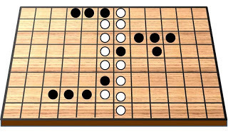 There is a qualifying restriction. A double open-ended row of three is illegal unless a player is forced to make the play. This refers to a row of three that simultaneously goes in two directions, forming a cross, an X or a T. Once constructed, such an alignment makes for an easy win.