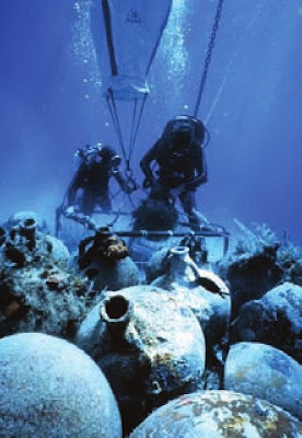 When hearing the word amphora, many people think of an urn-like container. In fact, amphora is also a unit of measurement. An amphora equaled 3 modius. Since a modius contains 2 ½ gallons of liquid, each amphora on the seafloor represents 7½ gallons. So, if the 2,500 intact amphorae comprised the entire cargo, the ship was carrying 18,750 gallons, or 150,000 pounds, of wine when it sank.