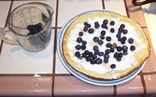 Ingredients: 1 cup flour, 2 Tbsp sugar, 1 cup milk, 3 eggs, pinch of salt and a pinch of nutmeg.Process: Put an iron skillet in a 425 degree oven and let it heat. Meanwhile, combine the egg and milk and whip until the eggs are dispersed. Add the other ingredients and whisk or beat until smooth. When your skillet is hot, carefully remove from the oven and run a stick of butter around the bottom and sides. Pour in your batter and return to oven for 15 minutes. The edges should be crisp and brown when it comes out. Remove from pan, dust with powdered sugar and top with fruit if desired.