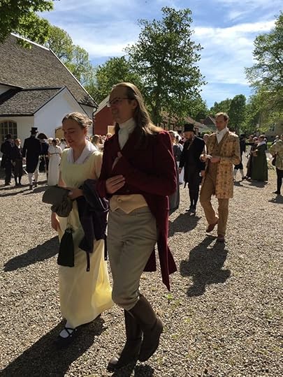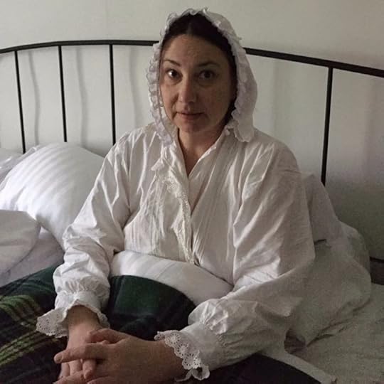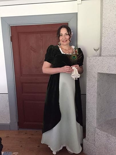 Now she is back at Primrose surrounded by a new generation of hopeful lovers. Mr and Mrs Rosewood will be there too. And Mother. The scene is set.Before we got there however, I had to sew. I have a closet full of costumes but they were all wrong. Regency fashions are like no other. I hate sewing, so naturally I put it off until the last minute. Old tablecloths and curtains were dug out, patterns found online and all else was put on hold. My (real) children would have to cook their own meals, the house would go without cleaning and the washing would pile up. Only the cat was amused by my efforts; as it included spreading fabrics on the floor. Fabric on floors are like Tivoli for cats. Fun! Fun! Fun!Of course I was not completed when it was time to leave. No buttons, hems un-sewn and I still hadn’t actually tried anything on with the corset. However, I sort of managed 3 outfits; 2 for day wear and 1 ballgown. Oh and I was rescued by my cousin who lent me a bonnet. It was green. I love my cousin.