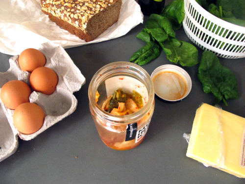 Salad Re-do: Kimchi, Spinach, Sharp Cheddar, Fried Egg