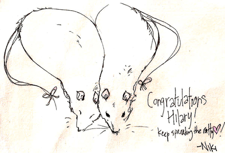 So, when NIGHTSHADE CITY debuted in October, some very sweet writer friends of mine sent me a big bag of goodies which included a hand painted frame of rats, an adorable mug that reads "Rats Rule!" (which of course they do), a bag of Cheetos (my favorite) and a slew of awesome cards! Of those, three were had drawn by some super fancy illustrators, Realm Lovejoy, Niki Smith and Stacey Vaughan!