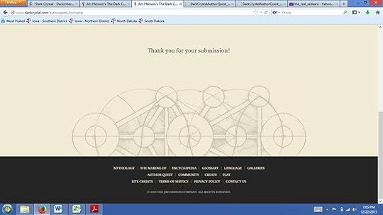 My goal was to get my Dark Crystal Authorquest submission turned in before Christmas, and I met that goal at 7:10 pm last night. It feels good to know that now it’s out of my hands.