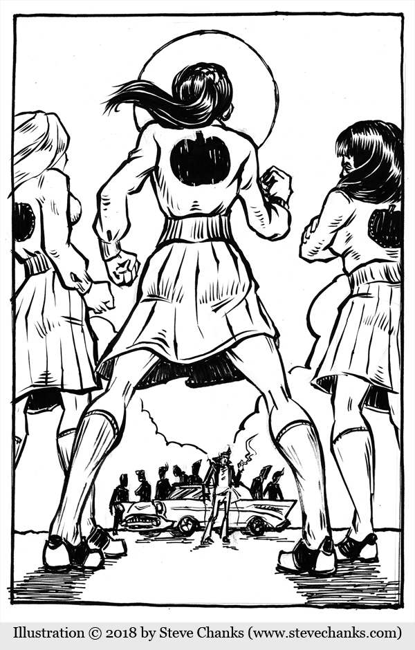 . . . The Fighting Pumpkins cheerleaders took up their usual position along the wall. Iris produced a pack of cigarettes. About half the girls took one, while the other half brushed their hair, or checked their lipstick, or did any one of a dozen other things that signaled “too cool to be in class, yet still too cool for you” to anyone who happened to wander by. Andrea waved off the cigarette she was offered, choosing instead to rest her shoulders against the wall and watch the others with a possessive predator’s eye.