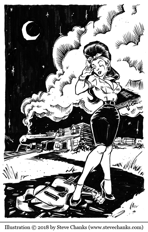 . . . I remember when I first paid true attention to her. She had been there all along, hidden behind a bland misfit mask, but now she was taking on a different look, and that’s why I noticed her. I had a different look too, and it was the music that changed us, that brought us together like a magnet to steel. I had on my blue jeans with the big cuffs, deep enough you could have kept your lunch money in them, had on a tee-shirt with the short sleeves rolled up to show what biceps I had. In that area, I needed a little work, but listening to the radio, to that hard-driving music, had turned me bold, made me want to look like my heroes. I had my hair slicked back with enough oil to lube a bone-dry Buick transmission, duck tail lifted up in the back, not to mention some wispy sideburns. There Belinda was, coming down the hallway in her dark teal, half-sleeve swing dress with white fringe at the bottom and on the collar, her flame-red hair, mounded up and flared out wide, the collar fringe swishing across her sun-kissed collar bones, as she walked in men’s lace-up shoes. Instead of a purse, she had a guitar, an old, worn Martin D-45 with a leather strap . . .