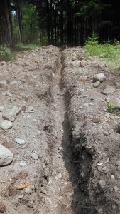 I spent a few weekends helping him dig this trench. (I considered it my workout for those weeks.) We used shovels and a digging bar.