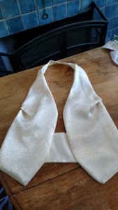 This is the vest that I’ll be wearing. It’s got an open back. I haven’t finished fitting it yet because I’ll be wearing it over the skirt, and I need to finish the skirt to get accurate measurements. It’s ivory satin, over lining, and over that is the netting with glitter.