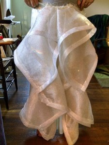 This is the skirt pattern. Notice the flounces. They’re all made of that netting with glitter. There are 6 flounces. 41 yards of horsehair braid around the edges of it.