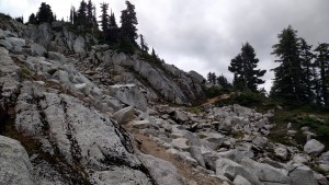 Looking up at the trail, through the rock fields.