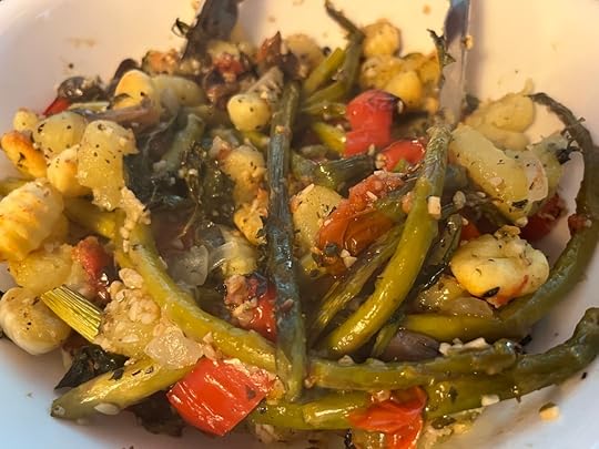 Preheat oven to 425 degrees FLine sheet pan with aluminum foil for easy clean upSpread all the vegetables gnocchi on a sheet panDrizzle olive oil over the veggies and gnocchi and toss with tongs to make sure they are completely covered. Add more olive oil if neededAdd garlic and dried herbs to sheet pan and toss with tongs againBake 40 minutesEnjoy