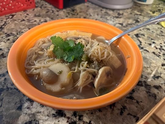 In a large pot, simmer 2 cups of vegetable broth with the garlic and ginger for 5 minutes.Add the remainder of the vegetable broth, miso broth, soy sauce, green onions, sprouts, baby corn, mushrooms, water chestnuts, bamboo shoots, cilantro, and dry parsley to the pot until the green onions, mushrooms, and baby corn are soft.Add salt and pepper for taste.Add ramen noodles and boil until the noodles are soft.Let cool for 2 minutes.Serve and top with fresh cilantro.Enjoy!