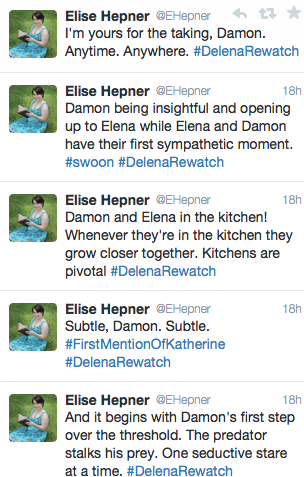 Coming your way tomorrow and every week on Tuesday on Twitter I'll be live tweeting one of my favorite TV shows and my OTP (one true pairing) The Vampire Diaries Delena (Damon and Elena). I'll be tweeting about all my favorite Delena episodes from Seasons 1-6. If you want to follow along make sure you're following me on Twitter at @EHepner and make your presence known!