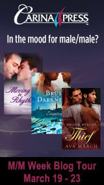 UPDATE: What I should have included in this post was ALL the places you can win copies of all six upcoming Carina Press M/M week releases (thanks, Chris!).