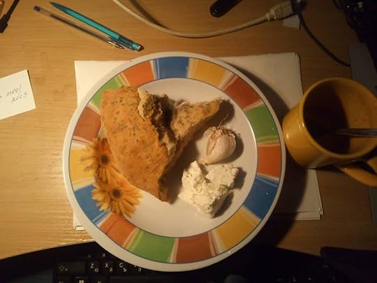 Бърза и проста, но вкусна закуска с парче мека питка с чубрица, сиренце, чесън и шипков чай пред монитора...