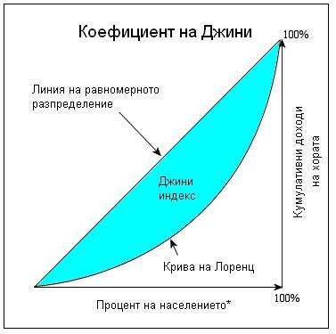 Стойностите но коефициента на Джини приблизително показват съотношението между доходите на 20% най-богати българи и 20% най-бедни българи ([image error]): [image error] и [image error]