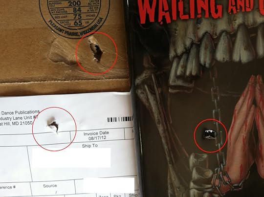 This is far from the first time I’ve seen a book damaged by the USPS or UPS or Fed-Ex, but this one seemed particular stabby, so I asked the customer if I could share the photo she sent us: