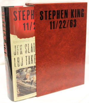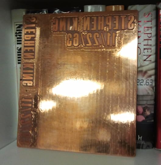 This is the "stamping die" from our special slipcase for the Scribner hardcover edition of 11/22/63 by Stephen King. The stamping die is used to press the hot foil stamping design onto a slipcase or book binding:
