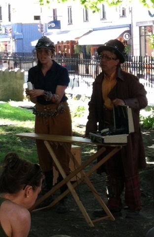 We happened to be in Quebec during a library's "Reading in the Park" event and stumbled upon these explorers who were touting the adventures they'd just had in books. We munched on our loaves of fresh bread and watched the performers as much as the audience filled of wide-eyed children and smiling adults who sat behind tables ready to check out some of the rolling carts of books they'd brought outside. Reading + Steampunk + Librarians + Acting Adventure? Sign me up! I only wish I'd kept up my French...