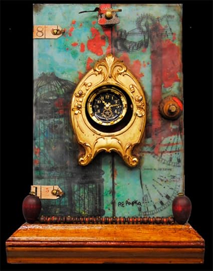 And, of course, I love books! (I know this is a great shock to anyone who's been following this blog...) Mix in steampunk and I think I'm ready for a well-earned read, but this time, I found something new to crave. Art! Ray Papka makes art out of altered books and I literally (literarily?) stopped in my tracks when I saw this gorgeous tome of a clock with brass fittings and splashed with red: