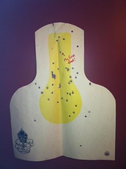 As you can see, my first shot was (pardon the pun) "dead center" & I don't know who was more surprised: me or my instructor. However, if you notice, a lot of the next attempts didn't come close; even if they were in the "kill zone" they weren't grouped anywhere near my first shot and, in fact, my aim got worse as the night wore on. The instructor had warned us of this happening, but it was frustrating to have it play out all the same. Strangely enough, it wasn't due to anything like nerves or fatigue, but something he described as "anticipating" the shot. When we first started, it was a surprise and we had better aim because we didn't know what to expect, but once we'd gotten a taste for what the gun could do, we started to try to out-guess ourselves, aiming for what we thought was the target instead of our first gut reaction of making our best guesses, which were usually more correct. We trusted ourselves more than the gun, which we held with a higher (and wary) respect. The more we thought we knew, the worse the result, the more frustrated we'd get and so on unless we "reset" and reached back for that original mindset.
