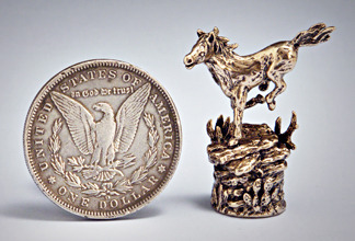 Daniel J. Ricco's is someone whose booth I visit each year and come away with another purchase. His bronze and silver pieces capture everything I love about miniatures, fantasy themes, and attention to detail. Everything from teeny tiny figurines to fairy bells and thimbles makes me want to pick it up and marvel. The animals are the sizes of bugs and the bells barely bigger than thimbles. It's like all of it belongs in a fairy tale princess's dollhouse. (And the artist himself looks like he should be a steampunk-y mad scientist! Always a plus in my book.)