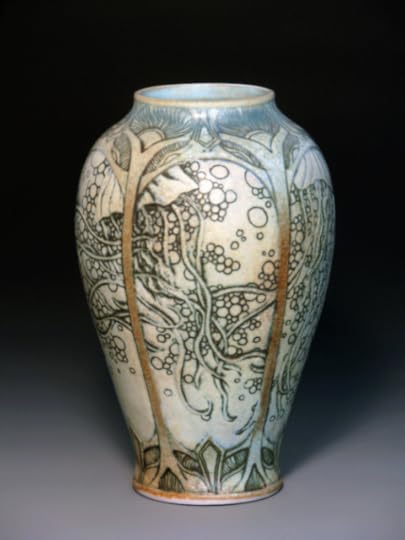 From itty bitty to giant pieces, Stephanie Young's carved-porcelain urns were something to gawk at: somehow capturing "nouveau" style with ancient-feeling themes, I was tempted to build a shelf just to display her work. Something like Greek or Atlantis plays in her watery patterns with butterflies, fish, shells, octopi and jellyfish (a huge theme this year throughout the festival), but her porcelain held something ancient in the pale blues and greens and chocolate browns...it's hard to describe, but worth more than one look! I could write entire books inspired by any one of her pieces.