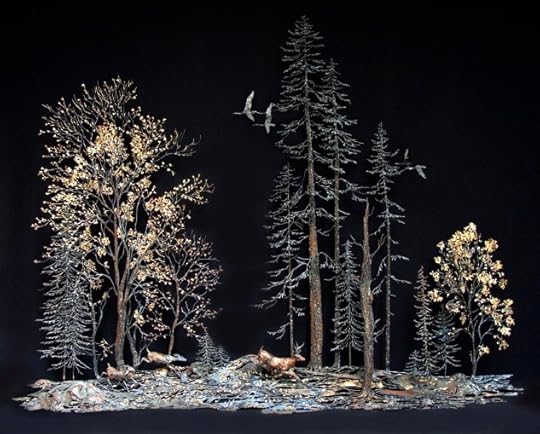 Ever see something that reminds you of someone else? Well, Robert Alan Hyde's work reminded me of all things Stiefvater: from wolves playing to swirling waves of horses to satyrs and fairies peeking through entire forest landscapes made of thin lengths of wire littered in gold leaves, I was awestruck by the complex beauty of these metal sculptures. Unique and intricate, his style managed the feeling of motion, line by line. I was utterly blown away!