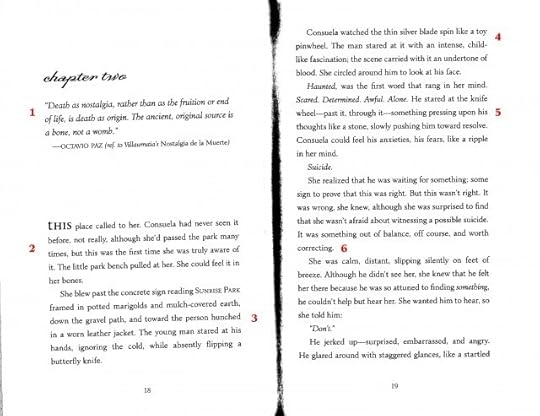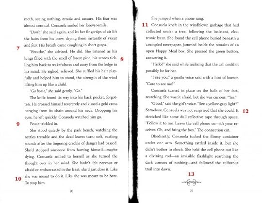 4) It's a call when to use short, choppy lines and when to string them together to make a long, complete image. This was a good example of how I changed one for the other. The pacing changes so it feels more like Consuela's physical approach in the storyline.