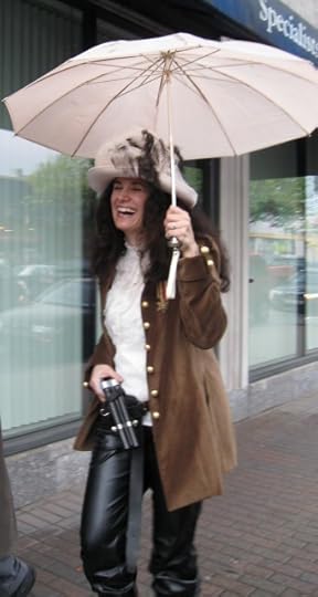 Yes, that's me, laughing in the rain (as opposed to singing in the rain, but I'm not that cruel to animals) having a great time in costume under an umbrella. Despite assurances that the sky was blue and the sun was shining, I've lived in New England enough to know better than be fooled and heeded Mark Twain's advice that if you don't like the weather in New England, just wait five minutes and it will change. So putting aside the fear of soaking my hat's bee-yoo-ti-ful plumage, it was a fun and lovely event out on the Waltham green; a real testament to random people's creativity and willingness to be silly in the face of an otherwise perfectly normal afternoon. (Many onlookers and innocent passers-by clearly noticed that it was anything but a perfectly normal afternoon!) But truly, that's part of the fun! The point is to "Scene and Be Seen!"