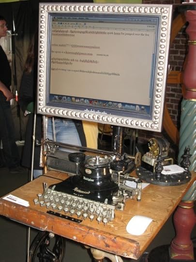 A steampunk computer: mounted, framed, and sporting typewriter keys on wooden desk