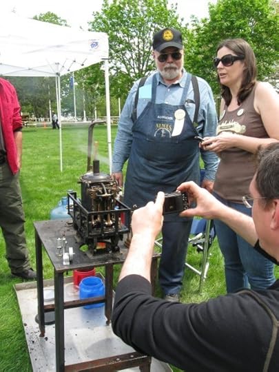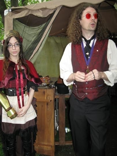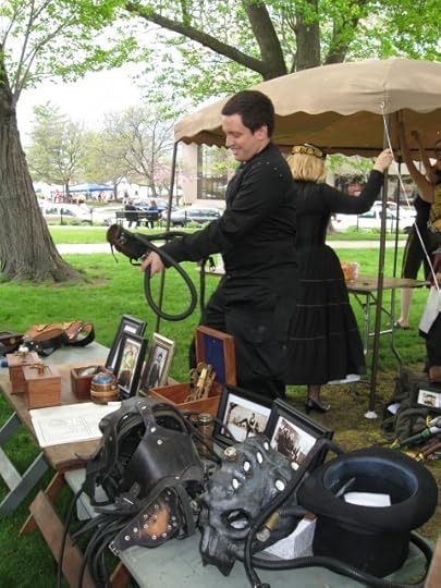 We entered the Visitor's Check-In to browse the indoor displays, pick up a newspaper of events, and repair my double-barrel sidearm that had broken a sight not five minutes into the festival. (Yay epoxy!) We quickly went to check out the display tables of trinkets and hats, the street performers with balloons and clocks, accordions and violins, and (of course) people-watch. The costumes and gadgets were a wide range of fantastic amidst a backdrop of music and merry mayhem that included giant-wheeled ancient bicycle rides and steam-powered model engines tooting and chugging and spurting impressively. My favorite pics are featured