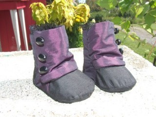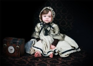 Let's start small. Like wee ones. I loved these adorable purple steampunk baby booties -- with black leggings and a suitable dress, I bet I could have made my mother laugh! But for a more serious and precious ensemble, nothing can compare to this exquisite Victorian baby dress (although I can't imagine any child of mine ever being allowed to eat anything while wearing it!) Doesn't she look adorable but hungry? Moving on...